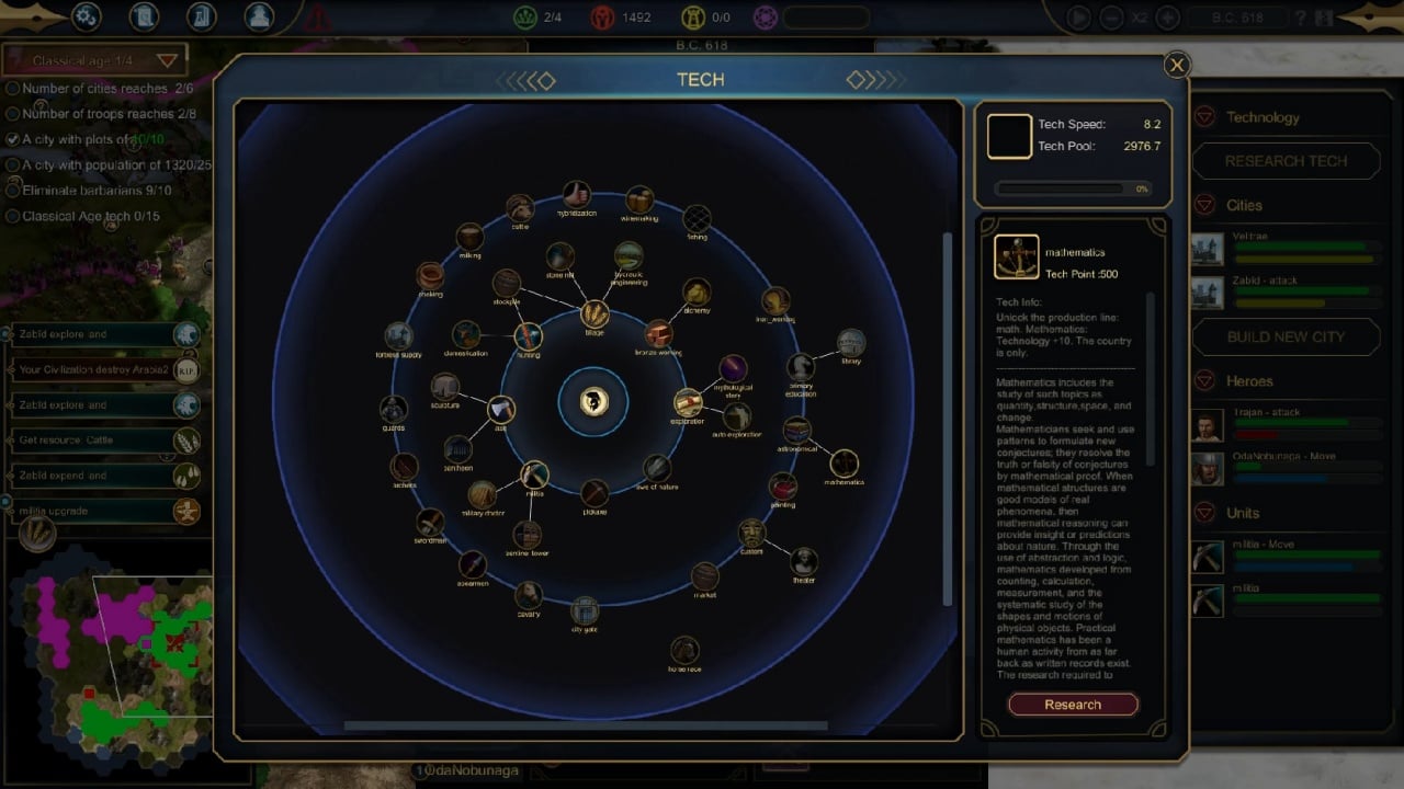 Технологии выступают основным источником смены строя города и развития жителей. Посредством новых технологий можно улучшать армию, производство и многое другое. Чтобы вступить в новую эру, необходимо закончить череду квестов. На выбор доступно несколько героев, каждый из которых имеет свои особенности и бонусы.