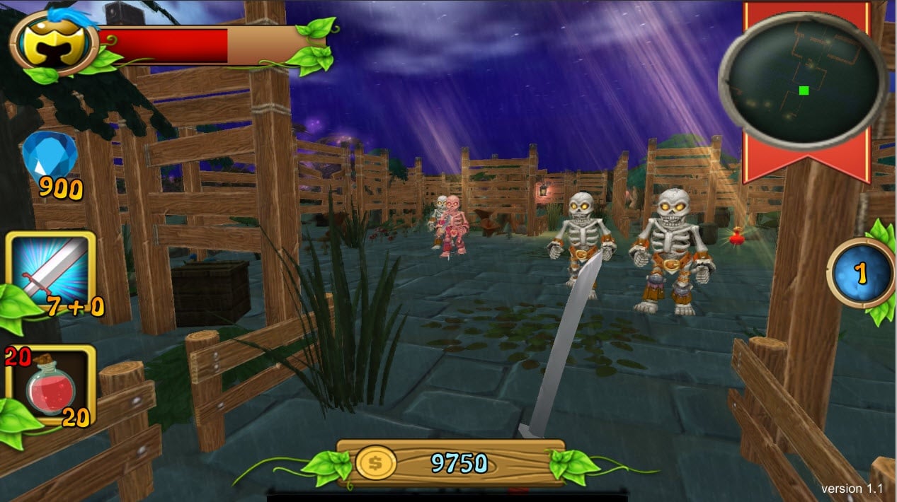 Схватки со скелетами, оборотнями, зомби и другими существами происходят чаще всего под открытым небом. Здесь есть только ближний бой. Восполнить HP можно с помощью бутылок с красной жидкостью. Традиционной прокачки нет. Персонаж усиливается за счет сбора разбросанных по коридорам усилений и покупки за найденные монетки и кристаллы более мощных мечей. Они различаются между собой внешне и наносимым уроном. Всего их 6 разновидностей. В игре представлен только этот тип оружия. В этом проекте встречаются баги. Иногда персонаж может пройти сквозь стену, а убитые враги порой не исчезают и ведут себя так, будто они всё ещё живы.