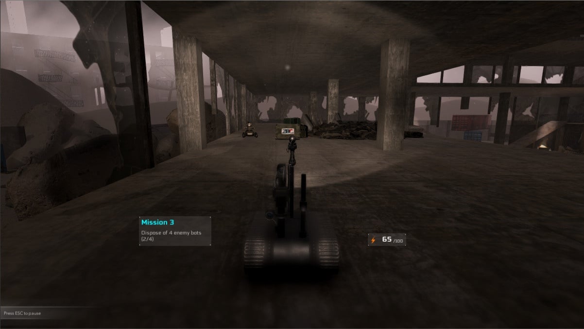 Помимо этого робот может провозить саперные работы. Если не обезвреживать мины, то на них можно подорваться. На передвижение и совершение всех действий тратится заряд аккумулятора. Подзарядиться энергией можно на специальных станциях. Ездить по уничтоженному населенному пункту стоит аккуратно, иначе эта техника перевернется. Выбора уровней здесь нет. После выполнения одного задания сразу же появляется следующее. Прогресс сохраняется автоматически на контрольных точках.