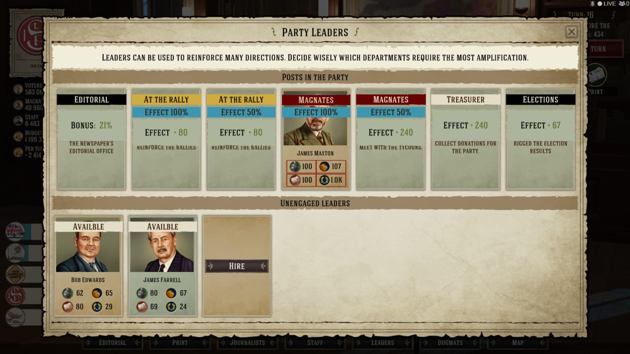 Игровой процесс строится на механиках, что позволяют поднимать рейтинги политической группировки. Игроку нужно контролировать средства массовой информации, распространять положительные данные о своих депутатах и их действиях на благо населения, проводить съезды для диалога с народом, назначение собственных помощников с уникальными наборами способностей, и многое другое. Присутствует возможность воспользоваться нечестными способами, например, подтасовать результаты голосования, или запугивать избирателей, любое средство хорошо для достижения целей.