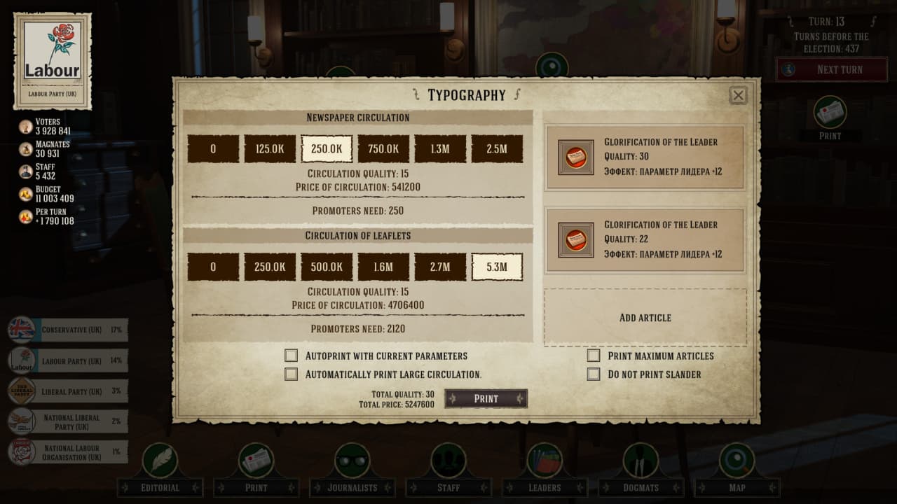 Однопользовательская кампания состоит из трёх доступных сценариев по странам, что разделены на 70 регионов. Нужно добывать доверия в ключевых районах для получения большинства голосов. Геймер получает возможность переписать европейскую историю при помощи своих решений, что принимаются во время прохождения, ведь пользователь выбирает из 29 настоящих партий, что существовали в те времена.