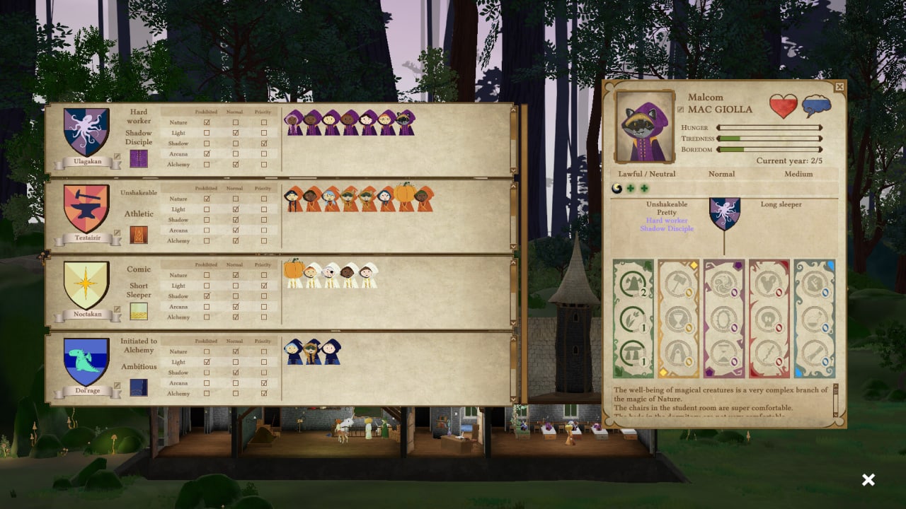 Геймеру нужно заниматься микроменеджментом школы, следя за её финансовым положением и вовремя проводя починку сломанных устройств для постоянного полноценного функционирования. Качественное обучение достигается при помощи найма опытных учителей, что действительно обладают качественными знаниями, которые будут полезны юным учащимся, желающим познать колдовство в полной мере.