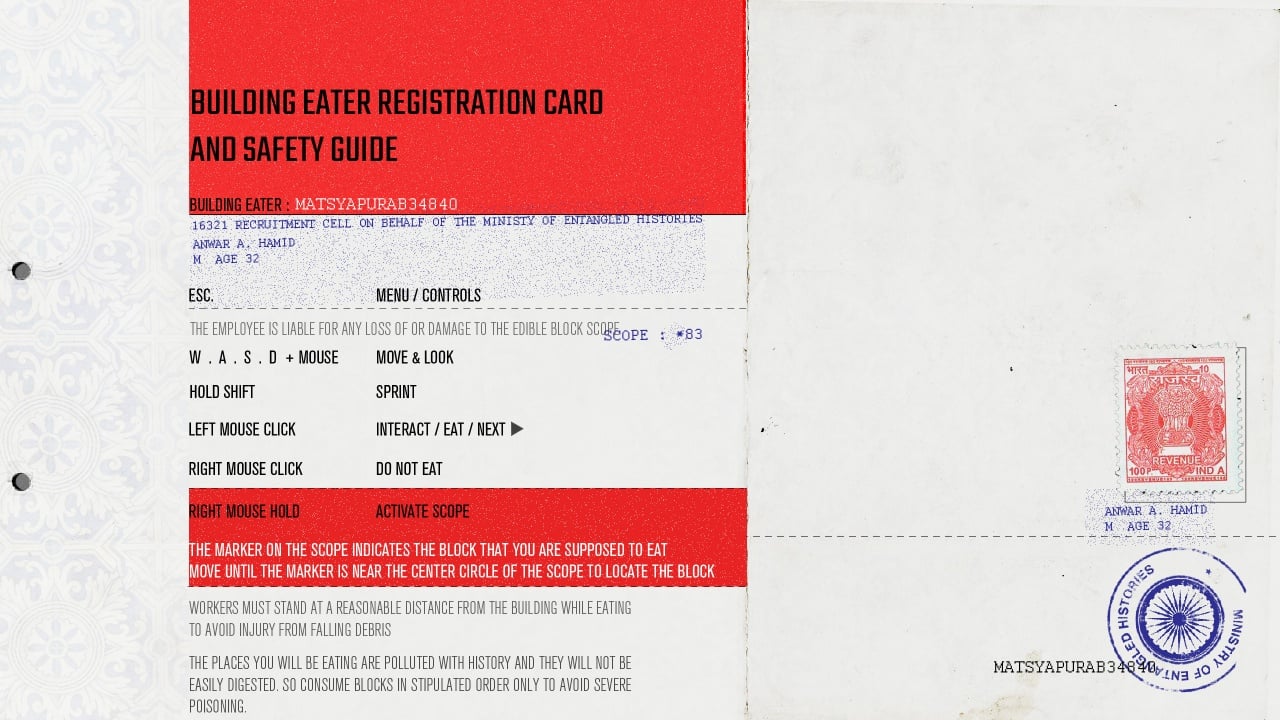 Разработчики The Indifferent Wonder of an Edible Place вдохновились рассказом и решили перенести эти трагические события в формат видеоигры. Узнайте про ужас разрушения мечети Бабри в Айодхье и многих других трагических событиях. Безразличное чудо съедобного места - это своеобразная визуализация поэмы, представляющее собой интерактивную книгу и переосмысление оригинальной истории.