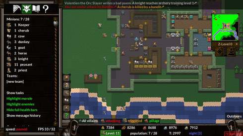 KeeperRL - симулятор с элементами рогалика, в котором предстоит строить подземную базу и развивать общество. Вы играете за могущественного волшебника, обучающегося черной магии. Обучайте миньонов военному делу, заставляя нападать на мирных жителей поселений, забирая их пожитки и сжигая дотла дома.