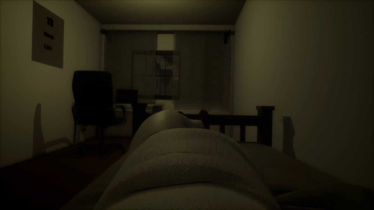 Bed Lying Simulator 2020 – это действительно симулятор лежания на кровати (с минимальной интерактивностью). В инди-проекте вид от первого лица. Тело главного героя отображается. Можно вращать камерой, рассматривая помещение и его конечности, и совершать пару простых действий, не вставая с уютного места. Например: отхлебнуть алкоголь из стеклянной бутылки.