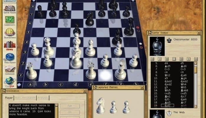 Chessmaster 9000 v 2.0.0.8 Новая версия Полная версия Последняя Дата выхода 2003 Разработчик Ubisoft Entertainment Жанр Стратегии Обновлено 25 января 2025, 23:34 Список изменений Chessmaster 9000 как можно понять из названия, является симулятором игры в шахматы. Здесь нет ничего кроме данной дисциплины, и ценители могут в полной мере насладиться таким проектом. Несмотря на казалось бы примитивное оформление без лишних спецэффектов, такой подход позволяет полностью сконцентрироваться на партии. Интерфейс также сделан просто, а колонки меню и все дополнительные функции расположены слева и в верхней части экрана. Там, в Chessmaster 9000 можно выбрать цвет фигур, вид доски (двухмерная и трехмерная), уровень сложности, а также слегка изменить цветовую гамму. Доступные вариации можно предварительно просмотреть в библиотеке, чтобы в дальнейшем выбрать удобный вид. Во время каждого матча в правой части экрана возникает еще одно окно. Там ведется статистика и запись ходов. Система фиксирует, когда именно был сделан тот или иной ход. Перестановки фигур осуществляется за счет "захвата" нужного объекта и его перемещение в определенную клетку. Помимо быстрых матчей, игра позволяет принимать участие в турнирах, а также проходить обучение в разных аспектах. Например, изучая шахматные дебюты, во время каждой симуляции система выдает подсказки, объясняющие особенности такой вариации. Если же во время этого процесса или любого быстрого матча геймер допустил ошибку, можно сделать возврат хода. Это позволит отменить одну или несколько перестановок, получив исходное расположение фигур. Скачать торрент Скриншоты Видео из игры Скачать Chessmaster 9000 Тип релиза Лицензия GOG (Таблетка: Не требуется) Версия v 2.0.0.8 (Полная) Последняя Размер 1.05 ГБ Интерфейс Английский Озвучка Отсутствует Скачать .torrent торрент файл Скачать БЕЗ торрента прямая ссылка через uTorria Альтернативные раздачи Прямые ссылки GOG версия (Без DRM) n/a 1 ГБ Показать Системные требования ОС: Windows 7, 8, 10 Процессор: Pentium II 450 / AMD K6-3 500 Оперативная память: 128 МБ Видеокарта: 512 МБ Место на диске: 1 ГБ Тактика, Логика, Обучение