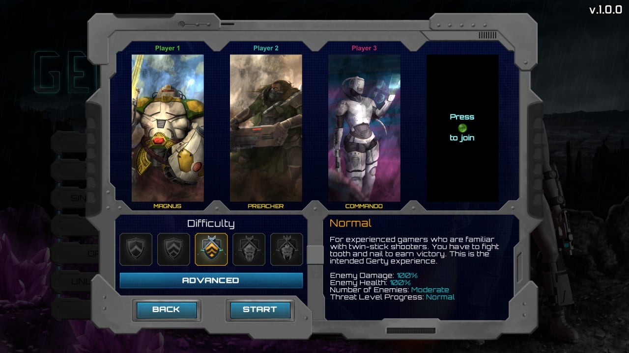 Доступно 5 уровней сложности, начиная от очень легкого, заканчивая настоящим хардкором. За время прохождения Gerty вы посетите инопланетные руины, алтари и т.д. Каждый последующий этап повышает ставки увеличивает сложность геймплея. Сразитесь с целой ордой чужеродной угрозы и уничтожьте ядро, питающее силы противников.