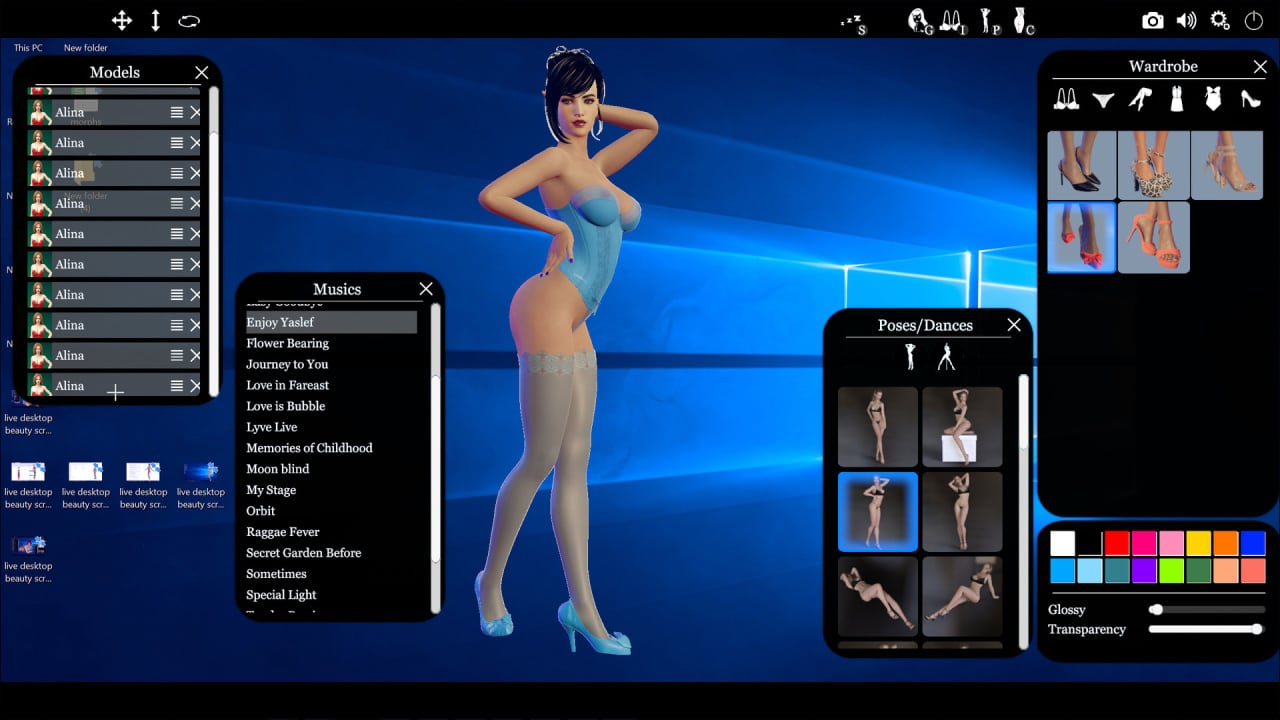 live Desktop Beauty - инди-проект, позволяющий создать девушку своей мечты и поместить ее на рабочий стол. Задайте параметры внешности, выбрав лицо, прическу, макияж, задав параметры ног, груди, фигуры и т.д. Девушки анимированы, умея танцевать, позировать и многое другое. В игре нет сюжета, только обширный редактор, позволяющий вам экспериментировать.