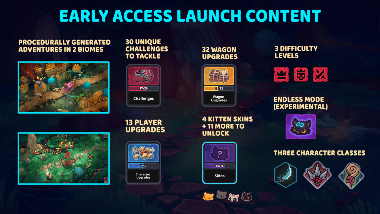Управление в Wild Woods очень простое. С помощью стика совершается перемещение, а три кнопки отвечают за атаку, перекатывание и взаимодействие с предметами соответственно. Можно подбирать и кидать вещи. Это кооперативный экшен-рогалик с видом сверху и сменой времени суток. Днем коты ломают деревья и кусты, собирают различные ресурсы и несут всё в повозку, пока та медленно едет. Камера следует только за ней. С наступлением темноты приходится защищать транспорт от барсуков и кроликов, а также поддерживать огонь в факеле, что освещает путь. Затем наступает новый цикл.