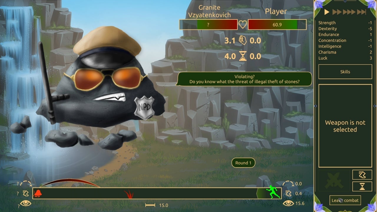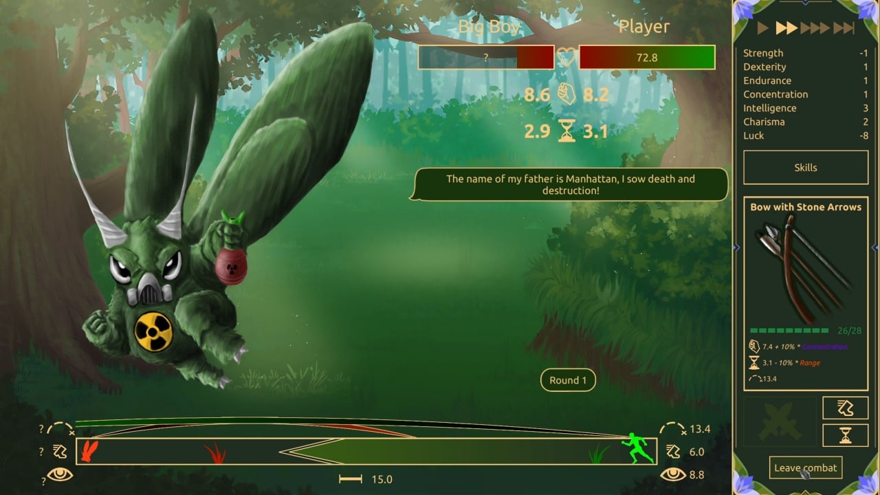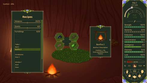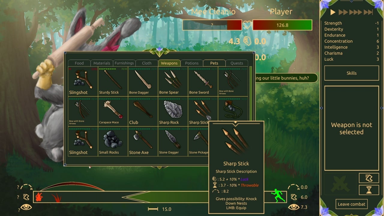 Поначалу будущий отважный воин вообще ничего не умеет. Со временем он обучается новым навыкам и становится сильнее. У бойца имеется 7 характеристик: сила, ловкость, выносливость, удача, интеллект, харизма и концентрация. Они в течение дня уменьшаются. Необходимо регулярно отдыхать, чтобы восстанавливать их до прежнего значения. Герой живет в пещере. Свое место обитания можно всячески улучшать. Есть сбор ресурсов, добыча пищи, крафт оружия и брони, приручение животных.