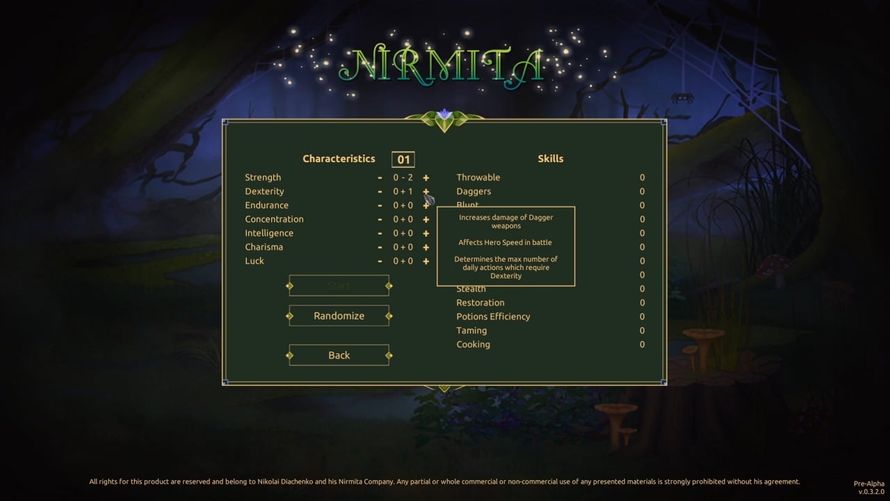 Nirmita: 2D Survival Fantasy RPG коротко раскрывает всю собственную суть в своем названии. Это ролевая игра с элементами выживания в открытом мире. Она используется фэнтезийный сеттинг и двухмерную графику. Визуал тут чаще всего служит фоном. В основном всё подается через текст. В инди-проекте есть смена времени суток. Бои здесь пошаговые.