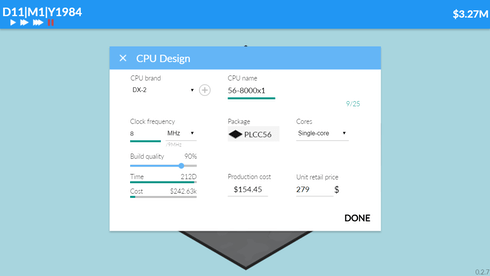 В Hardware Tycoon 4 уровня сложности: легкий, средний, тяжелый и очень трудный. Они выбираются при создании будущей корпорации. Вначале дают придумать название для компании, и ввести имя её генерального директора. Пользователи стартуют в 1970 году. У них есть 50000 долларов и маленькое помещение с минимальным количеством мебели для одного человека. Время можно ускорять, замедлять и ставить на паузу. Проект находится на очень ранней стадии разработки. В сырой версии можно только разрабатывать процессоры, и проводить исследования в этой отрасли. Игра позволяет при создании CPU подписать сам бренд и назвать как угодно текущую линейку чипов, определиться с частотой, сокетами, количеством ядер и общим качеством сборки, выставить цену для конечного потребителя. Чем круче должен оказаться продукт, тем дороже обойдется процесс его разработки, создания и производства.
