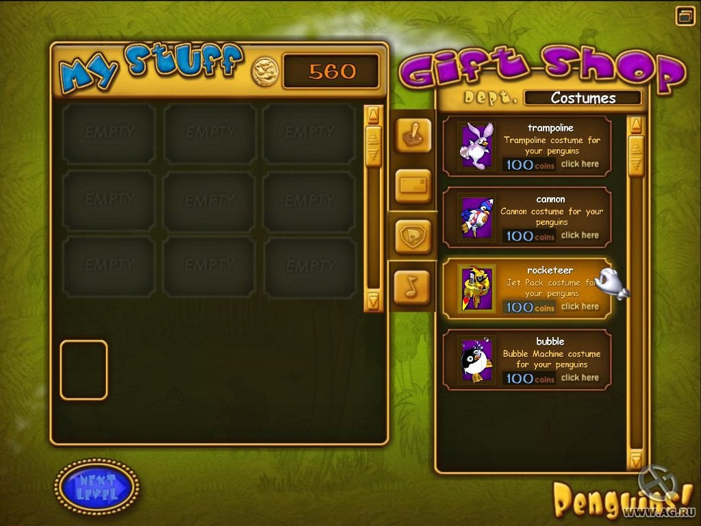 Penguins! RUS Полная версия Последняя Дата выхода 2006 Разработчик WildStudio Жанр Аркады Обновлено 14 февраля 2025, 21:11 Список изменений В Penguins! Предстоит спасти нелетающих морских птиц, которым дали плохие условия в зоопарке. Пернатые мечтают сбежать от злого и жестокого работника. Геймеру придется помочь несчастным, руководя их походом по 40 увлекательным уровням. Разнообразные локации имеют свою сложность, ловушки и препятствия. Потребуется решать головоломки, чтобы доставить 25 зверей в целостности и сохранности. По всей дороге разбросаны монетки, которые являются внутриигровой валютой. Между миссиями можно заходить в магазины и покупать различные дополнения в виде скинов для пингвинов или бонусные задания. Можно одеть представителей фауны в костюм зайчика, супергероя. Наличие ракетного ранца и пузырьков. В квесте Пингвины! предстоит проявить смекалку, ведь требуется сохранить всю стаю. Местности отличаются своей атмосферой, разнообразными платформами и другим. Можно прокатиться по замерзшей поверхности, побывать в джунглях, сказочных пещерах, ощутить азиатскую тематику, таинственные лесные просторы, крыши зданий и другое. Появляются звери с помощью трубы, которая обрывается и переносит на новый уровень. Если пернатые оказываются у стены, они меняют направление. В определенных местах находятся подарки, которые дают дополнительный материал. В арсенале у геймера может присутствовать следующее: батуты, пушки, машина с пузырями, которая дает на время левитацию, лестницы и другое. Расставляя инвентарь, можно перемещать животных. Необходимо продумать все, чтобы ни один зверек не упал в пропасть или не оказался в капкане. Скачать торрент Скриншоты Показать больше Видео из игры Скачать Penguins! Тип релиза Пиратка (Таблетка: Не Требуется) Версия (Полная) Последняя Размер 176.79 МБ Интерфейс Русский Озвучка Отсутствует Установка: Скачать .torrent торрент файл Скачать БЕЗ торрента прямая ссылка через uTorria Системные требования ОС: XP, Vista, 7, 8, 10 Процессор: Pentium 3 - 800MHz Оперативная память: 256 МБ Видеокарта: Совместимая с DirectX 8.1 Место на диске: 50 МБ Казуальная