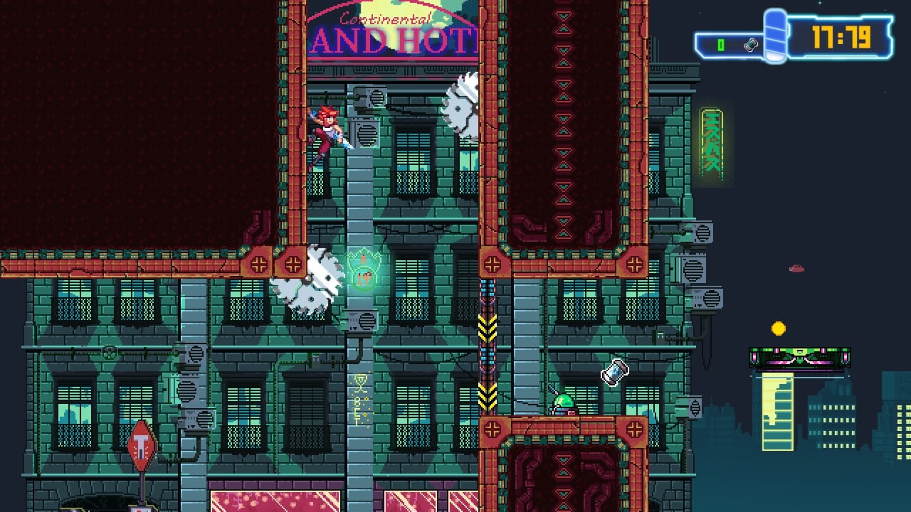 Aeon Drive – это динамичный экшен-платформер в сеттинге киберпанка. Основной упор в нем делается на скоростное прохождение уровней (всего их 80). Для прохождения этапа нужно добежать до конца карты до истечения таймера. Есть не успеть, то забег по локации придется начинать заново. Есть таблица лидеров, где подсчитывается затраченное время, количество убитых противников, собранные деньги и найденные алмазы.