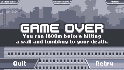 Доступны таблицы лидеров, показывающие ваш личный рекорд и лучшие результаты игроков по всему миру. Уровни генерируются рандомным методом. Требуется всегда быть начеку, поскольку никогда не знаешь, что ожидает впереди. Перепрыгивайте пропасти, преодолевайте различные барьеры и т.д. Режимы игры предлагают различный челлендж. Например, бежать по невидимыми зданиями или преодолеть маршрут, где отсутствуют ящики-препятствия и многое другое.