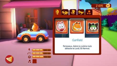 Garfield Kart – это аркадные боевые гонки. Игра основана на мультсериале про кота Гарфилда, а не на комиксах или фильме. Изначально доступен он сам и Джон. Остальных героев необходимо разблокировать. Всего здесь 8 персонажей, включая Арлин, Одди, Лиз, Нермала, Гарри и Писк.