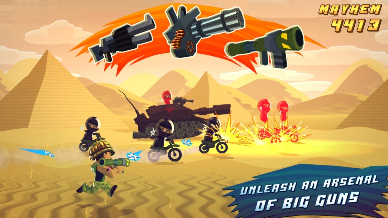 Геймер может только наводиться на цели, стрелять и прыгать. Боец передвигается самостоятельно. Для него можно открыть разные скины. В игре 45 уровней. Присутствует система ачивок (около 100 штук). Также есть мини-достижения в количестве 150 единиц. За их выполнение дают в награду золото. Арсенал представлен 20 видами пушек. Стволы открываются постепенно за заработанные монеты. Помимо этого деньги тратятся на покупку брони и дополнительных способностей, вроде авиаудара.
