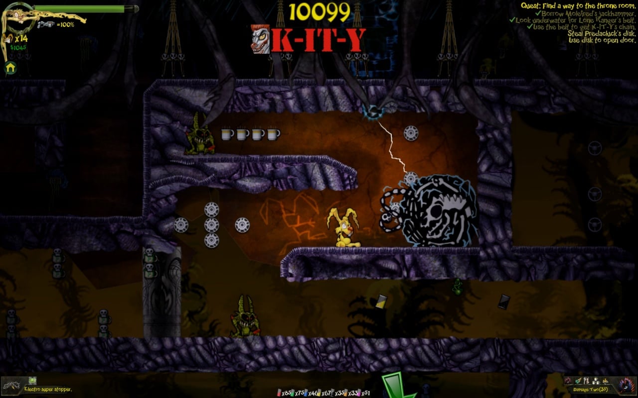 Кролик уничтожает противников из 7 видов оружия. Есть автомат, ракетница, гранатомет, лазер и т. д. Свое здоровье он восстанавливает с помощью разбросанных повсюду кофейных чашек и кусков пиццы. В игре 4 больших уровня с бэктрекингом. Также присутствует магазин, где можно покупать апгрейды для персонажа. Помимо этого есть простая система крафта. Периодически любитель кофе находит различные зелья и смешивает их между собой. Для создания полезных предметов сначала надо отыскать рецепты. Полученные напитки позволяют выше прыгать, наносить больше урона, дают временную неуязвимость.