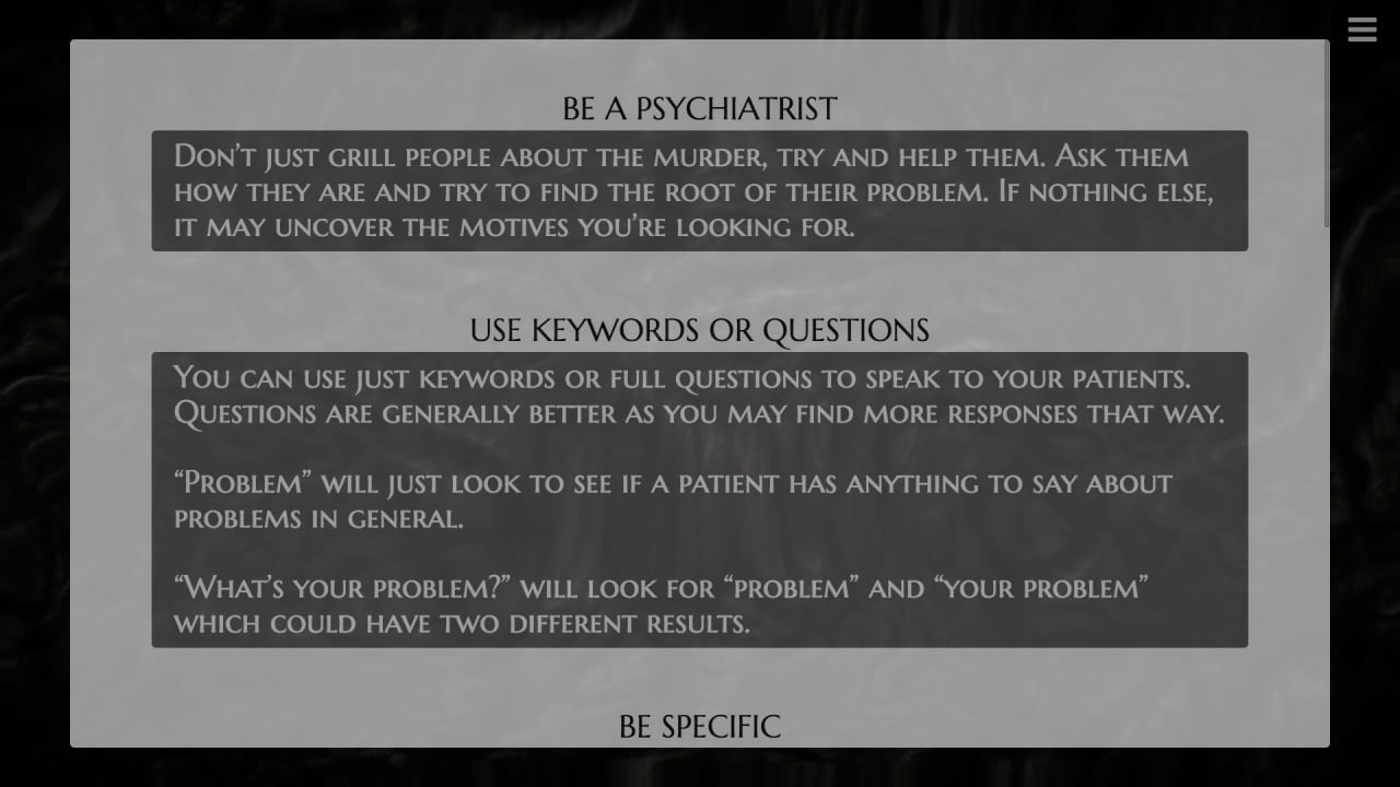 Иногда на помощь приходит профессор Олдерби. Игра поднимает взрослые темы и не боится говорить о психологических проблемах. Обсуждайте с пациентами сексуальные темы, насилие, самоубийство и многие другие вопросы. Проект дает полную свободу действий. Вы можете ввести любой ответ или вопрос, а не выбирать их из заготовленного списка. Выясните, кто стал убийцей доктора Деккера в этой запутанной истории, вдохновленной работами Лавкрафта. Проникните в мрачные и ужасные чертоги разума таких героев, как Марианна, Джая, Натан, Элин, Клэр и Брайс. Полагайтесь только на свой ум, интуицию и дедукцию, пытаясь принять правильные решения.