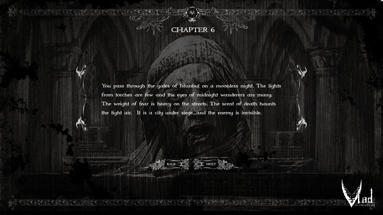 Vlad the Impaler - визуальная новелла, выполненная в черно-белых тонах, рассказывающая про известного правителя всех времен - Влада Цепеша, которого многие знают по прозвищу Дракула. Город погряз в крови и насилии. Будучи правителем, Влад жестоко убивает своих жителей. В основе игрового процесса лежит выбор, который может привести либо к гибели целого города, либо к кончине жестоко правителя.