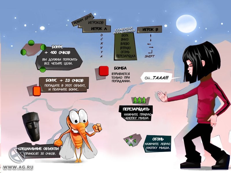 Mosquitos - динамичная аркадная игра, которая призвана развить вашу реакцию. Суть игрового процесса крайне проста: вы находитесь в центре нашествия полчища комаров. Москиты окружают вас со всех сторон. Их рой буквально повсюду! Ваша задача состоит в том, чтобы в кратчайшие сроки избавиться от надоедливой мошкары.