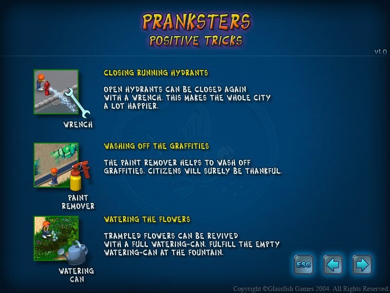 Pranksters: Treasure of the Indians - аркадная игра, рассказывающая про небольшой городок, который никогда не знал бед. Они жили в мире, как в один день улицы заполонили бандиты и хулиганы. Вандализм перешел все грани, когда стены городка стали изрисованы граффити, трава в парках истоптана, а каждый водитель боится оставить машину без присмотра, поскольку велика вероятность ее разгрома и угона. Местные жители боятся выходить на улицу и все, что сейчас нужно городу - свой герой.