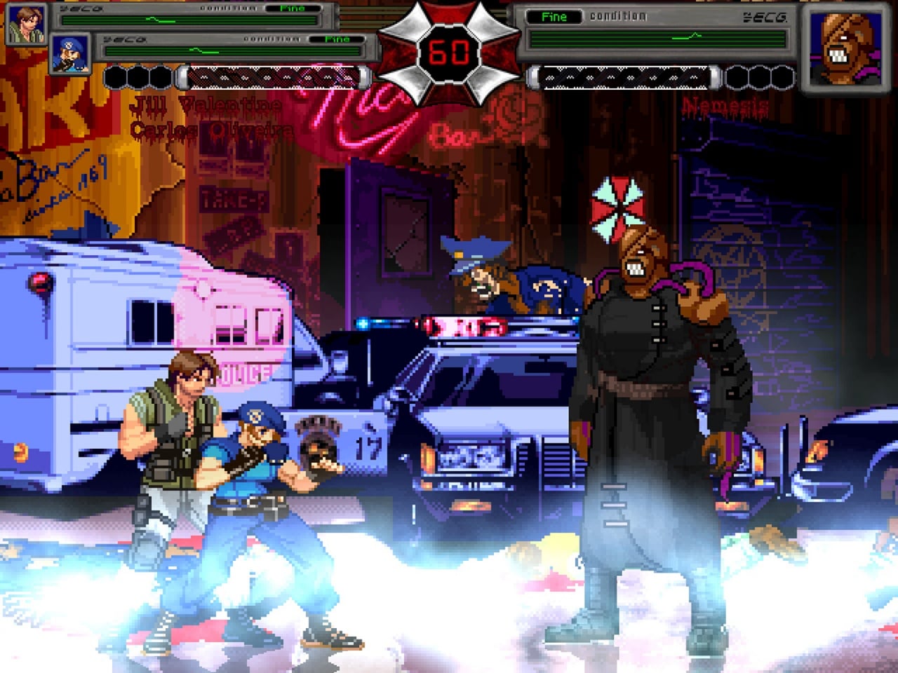Ростер персонажей насчитывает 12 бойцов, каждый из которых имеет уникальные способности и представлен особыми паттернами движений. Помимо аркадного режима и версус-игры, сыграйте в режим Биологической Угрозы, где необходимо преодолеть 10 уровней, наполненных зомби и другой нечистью оригинальной серии игр.
