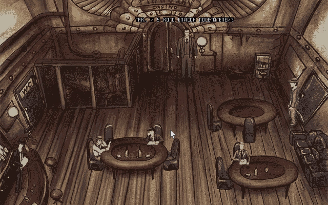 В Casino Noir практически отсутствует анимация. Вместо полноценных заставок тайтл использует текст, наложенный поверх картинок. Протагонист мгновенно перемещается между экранами (часть из них полностью статична). Ходить внутри локаций герой не умеет. Он просто находится в углу зоны, даже когда пользователь кликает на недалеко стоящего непися или объект, к которому необходимо применить вещь. К слову, тут есть инвентарь, куда складываются все найденные предметы. Другие люди тоже обычно просто стоят и редко совершают телодвижения.