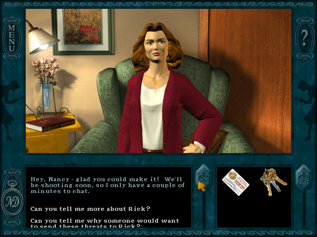 Игра "Нэнси Дрю: Опасность за каждым углом" – это квест от первого лица, где экран поделен на 3 сегмента. Самая большая площадь отображает то, что главная героиня видит перед собой: персонажей, объекты, декорации и т. п. Внизу находится специальное поле, где показываются текстовые описания и диалоги. А справа расположен инвентарь.