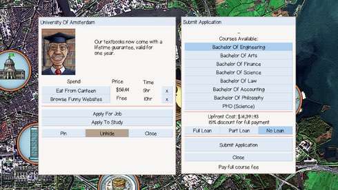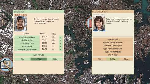 Геймер полностью следит за финансовым состоянием человека, который попадает под управления и решает, чем ему заниматься каждую неделю, ведь игра предлагает множество вариантов, и не всегда понятно, какой из них будет правильным. Это будет заставлять больше раздумывать над действиями, а обширное меню статистики наглядно покажет, к чему приводят те или иные решения.Какие сферы будут под контролем пользователя: