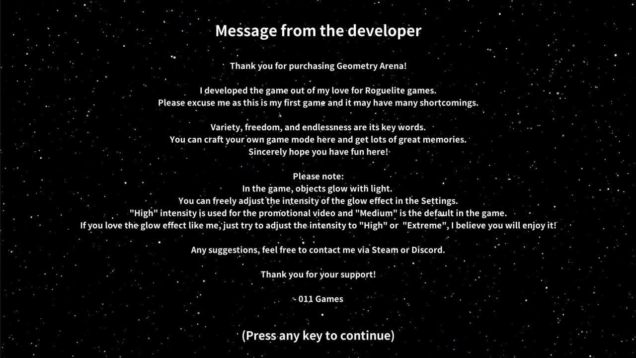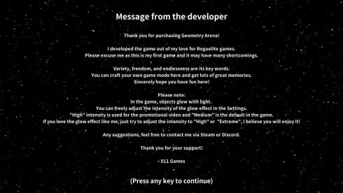 Geometry Arena – аркадный экшен с видом сверху, обладающий минималистичной графикой и яркими спецэффектами, что, порой, занимают большую часть экрана из-за высокой интенсивности проводимых сражений. Проект использует механики популярного жанра "рогалик" для создания уникальных уровней с рандомными характеристиками вражеских юнитов, что генерируются при помощи специально обученного искусственного интеллекта. Большая гибкость кастомизации собственного протагониста позволяет создавать несколько сотен различных билдов, что имеют право на жизнь, и доказывают это своей эффективностью на поле боя при правильном использовании имеющихся преимуществ.