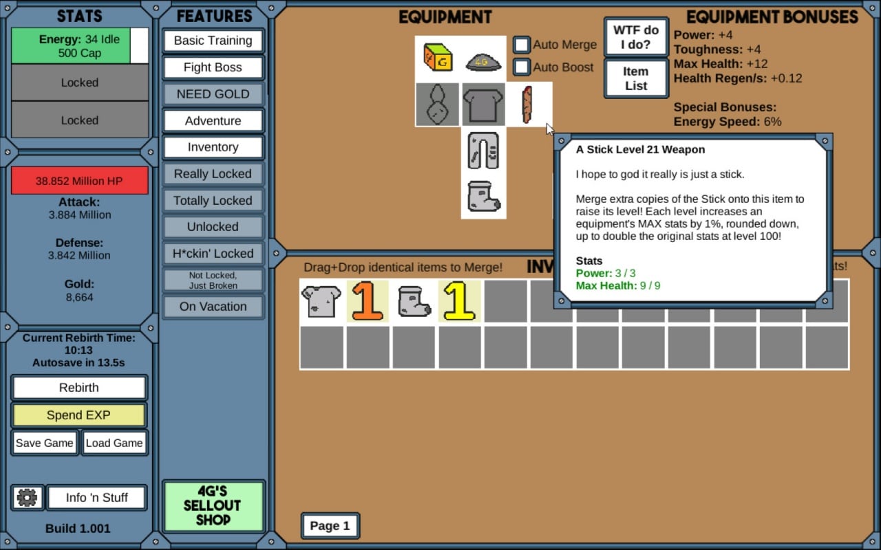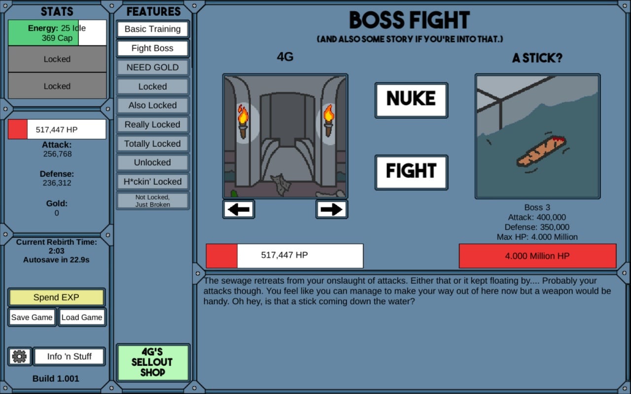 NGU IDLE – проработанный кликер с громадным количеством контента, которого хватит на длительное время. Геймеру, как и в остальных играх этого жанра, необходимо постоянно развиваться для разблокировки доступа к более высокоуровневым испытаниям, что были заготовлены инди-разработчиками из студии "4G". Индикатором того, что пользователь добивается успеха, является рост цифр урона, дохода, ресурсов, вместительности складских помещений и многих других показателей. После достижения определённого прогресса, появляется возможность автоматизировать процесс для того, чтобы фармить даже в оффлайне.
