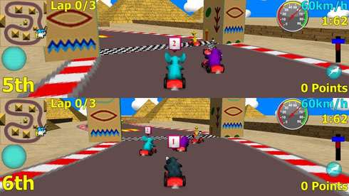 На дороге разбросаны многочисленные бонусы. Алмазы предоставляют дополнительную скорость. При помощи ракет, кувалды и колес можно стучать по противникам или взрывать их, чтобы убирать с трассы нечестным образом. В геймплее представлена трехмерная графика, иногда на дороге появляются трамплины или внутриигровые средства, позволяющие открывать больше вооружения для соревнований. Пользователь воспользуется 6 персонажами на выбор, сыграет на одном устройстве с другим участником, примет 4 тематические чашки и прокатится по 12 оригинальным трекам.