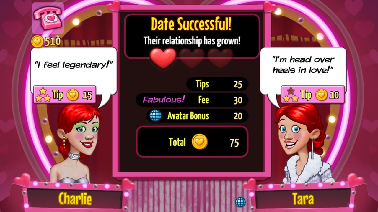 По ходу прохождения центральный персонаж зарабатывает репутацию, за счет которой открываются новые места для свиданий, появляется требовательная клиентура и новые обновления для своего предприятия. Игрок способен отправлять подопечных с красивым внешним видом и прекрасным подарком, чтобы на максимум повысить шансы нахождения любви. Юзеру потребуется принести в мир романтику, либо оставить кучу разбитых сердец и делать это можно по выбору.