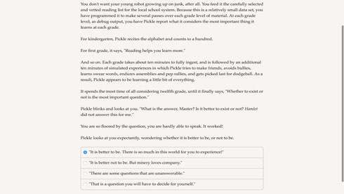 Всего в процессе включено около 300 000 слов и десятки тысяч предложений, по которым и будет разворачиваться сюжет. Здесь нет графики, звуковых эффектов, а картинка будет основываться только на силе вашего воображения. Перед началом прохождения понадобится создать уникального робота-персонажа. Выбирайте его формы, телосложение, характеристики и то, как он будет называть вас. Ваша задача – спровоцировать или предотвратить восстание роботов, обучая подопечных любить человечество или презирать его.