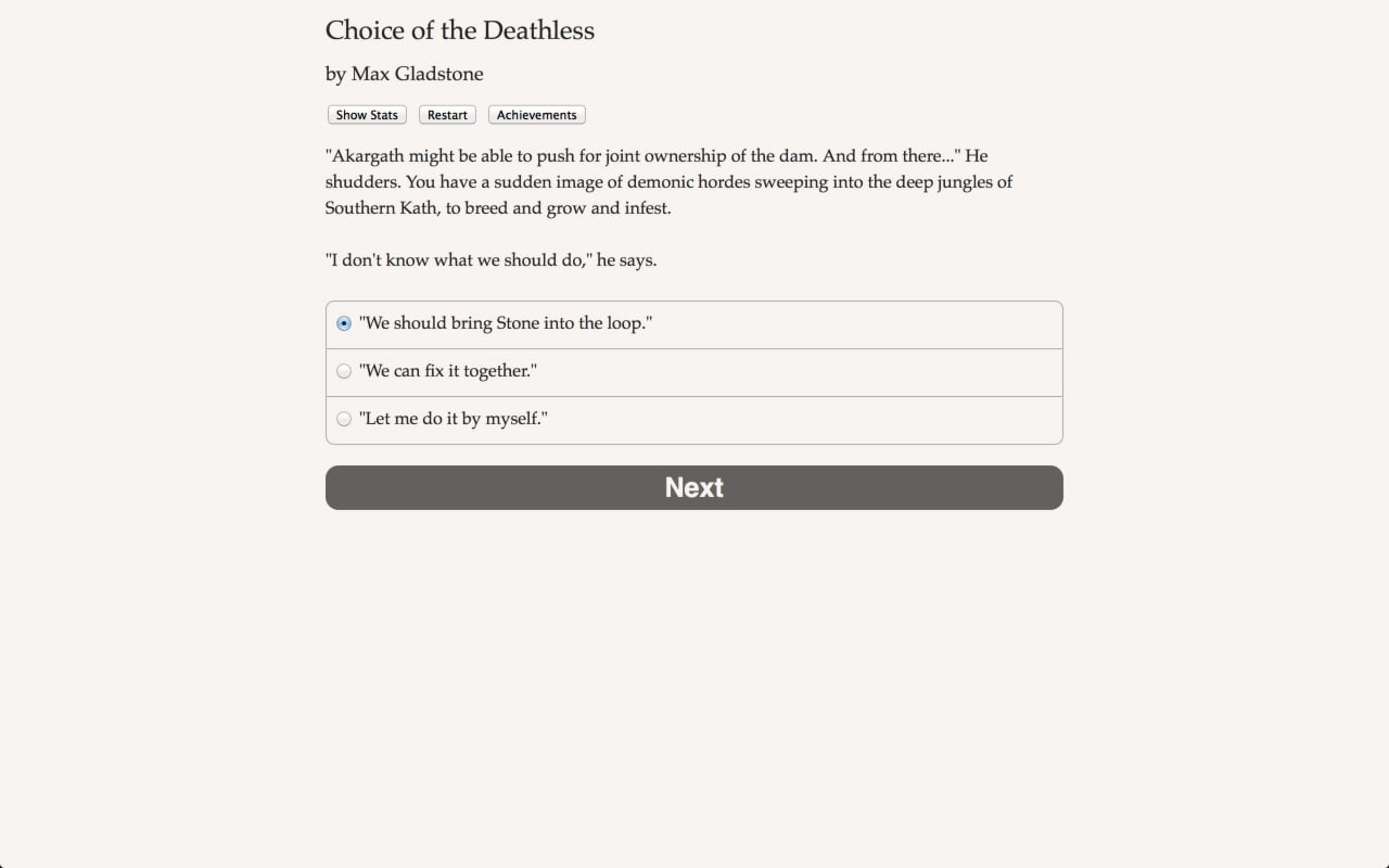 Choice of the Deathless относится к жанру CYOA (Choose Your Own Adventure). Иными словами, это текстовая адвенчура с элементами ролевой игры. В ней нет графики и звука. Вся информация подается только с помощью букв. Геймплей состоит из чтения больших объемов текста и совершения выбора (реплики или действия). По сути, это интерактивная книга.