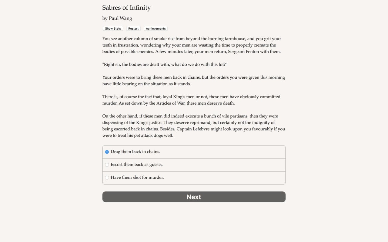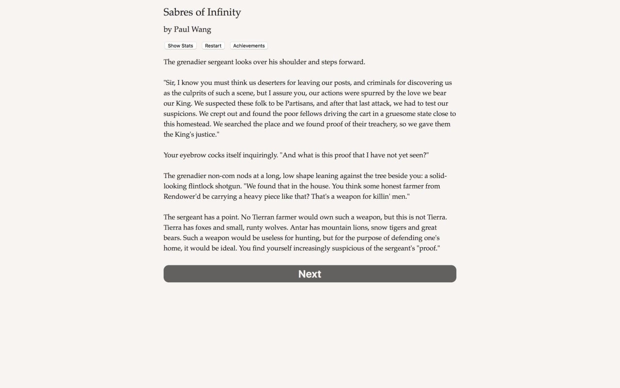 Sabres of Infinity – это интерактивная книга и по совместительству текстовая адвенчура. В ней практически нет графики. Представление о мире формируется через словесные описания. Порой юзеру дают совершить выбор, и иногда действия влияют на повествование. Но пользователь тут чаще является пассивным наблюдателем, чем активным участником событий. Это первый эпизод саги.