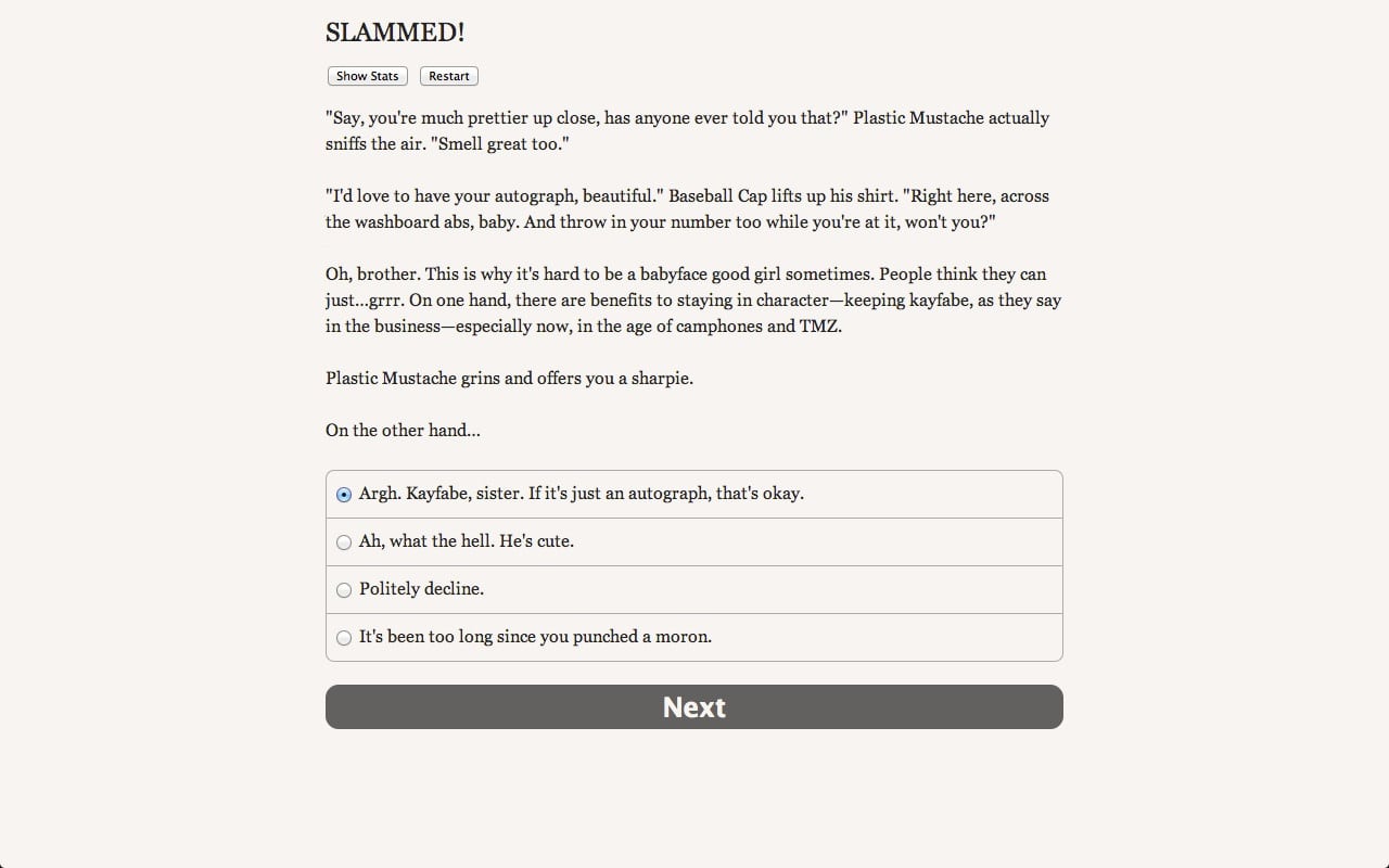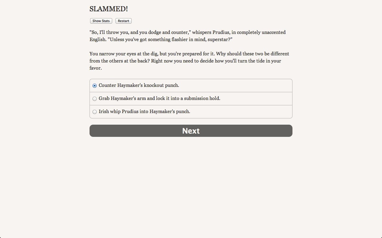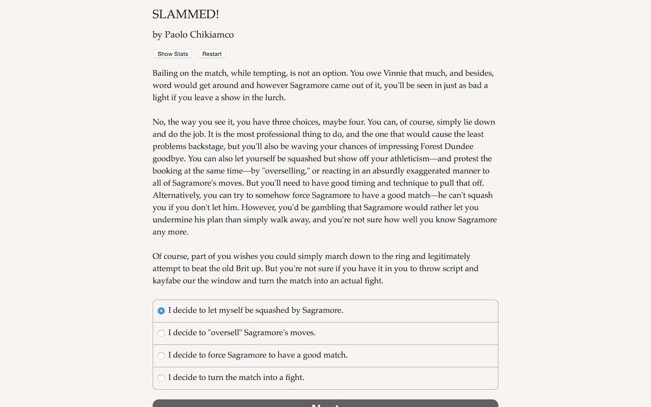 SLAMMED! v Demo (Steam) Новая версия Полная версия Последняя Дата выхода 30 янв. 2015 Разработчик Choice of Games Жанр Инди, RPG Очень положительные на основе 102 обзоров в Steam 94% Обновлено 17 февраля 2025, 15:46 Список изменений SLAMMED! сложно отнести к стандартным проектам, где используются привычные механики. Это интерактивный роман объемом в 250 000 слов, который рассказывает о герое, мечтающем стать звездой профессионального рестлинга. Но он еще не знает, какой путь предстоит пройти для этого. Каждый день необходимо полностью отдавать себя этой работе, а предательство со стороны может прийти в любой момент. В зависимости от того, чему хочет уделять внимание геймер, он может развивать физическую силу, ловкость, придумывать собственные уникальные приемы или сконцентрироваться на собственном медийном образе. Для достижения успеха можно выбрать сразу несколько дорог, и каждый отдает предпочтение тому, что нравится больше. Несмотря на то, что в SLAMMED! основной акцент делается на повествовании и не содержит интерактивных моментов, у пользователя есть возможность повлиять на развитие сюжета. Это касается не только совершения конкретных действий, но и ответов в диалогах, а также принятие решений на внутреннем уровне. Так, в конце каждой страницы имеется отдельная графа, где есть три варианта на выбор. Например, можно перевести постановочный бой в настоящую зарубу, или не дать обмануть себя, заподозрив неладное. Кроме того, игрок волен создавать персонажа с нуля, выбирая пол и создавая полностью уникальный образ. Здесь нет визуальных дополнений, видео-вставок или прочих дополнений, поэтому геймер может только представить, как бы выглядели те или иные события. А учитывая количество сюжетных поворотов, такой аспект становится особенно ценным. Скачать торрент Скриншоты Показать больше Видео из игры Скачать БЕЗ торрента прямая ссылка через uTorria Альтернативные раздачи Прямые ссылки Облачные хранилища v Demo (Steam) Показать Системные требования ОС: 7, 8, 10 Выбери себе приключение, Протагонистка, Решения с последствиями