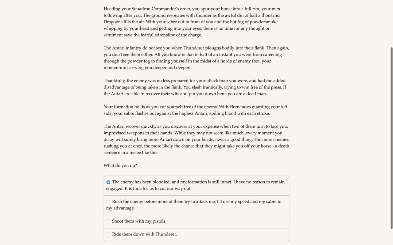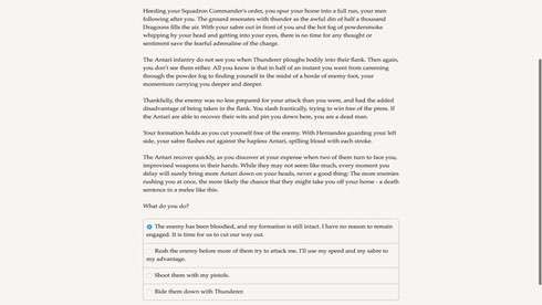 Sabres of Infinity Полная версия Последняя Дата выхода 29 мар. 2016 Разработчик Hosted Games Жанр Приключения, RPG, Инди Очень положительные на основе 179 обзоров в Steam 93% Обновлено 26 января 2025, 08:34 Список изменений Sabres of Infinity в очередной раз предлагает пользователям ознакомиться с интерактивным романом. Здесь, читатели переносятся во вселенную, где идет война между Тьеррой и Антарисом. В качестве представителя джентельмен-рыцаря Королевских Драконов, игроку предстоит принять ряд судьбоносных решений, способных повлиять на исход глобального противостояния. Чем готов пожертвовать такой воин ради победы? Своими людьми, своей судьбой или, может быть, даже собой? По ходу всего повествования Sabres of Infinity неоднократно ставит геймера в неудобное положение. Это может быть как банальный ответ на вопрос или фраза в диалоге, так и конкретный приказ в бою. В каждой ситуации все зависит от контекста и конкретной ситуации, поэтому пользователю следует внимательно вчитываться в то, что содержится на очередной странице. Из-за отсутствия каких-либо визуальных дополнений, артов или концептов все, что описывается в произведении, можно визуализировать только с помощью воображения. И хотя сюжет истории прописан заранее, некоторые решения напрямую влияют на ход событий. Даже если это касается незначительного события, после того или иного решения отношение персонажей к главному герою может измениться. За счет такого хода можно пройти игру несколько раз, чтобы прийти к разным концовкам и увидеть все возможные варианты развития событий. Скачать торрент Скриншоты Показать больше Видео из игры Скачать Sabres of Infinity Тип релиза Пиратка (Таблетка: Вшита) Версия (Полная) Последняя Размер 28.29 МБ Интерфейс Английский Озвучка Отсутствует Скачать .torrent торрент файл Скачать БЕЗ торрента прямая ссылка через uTorria Системные требования ОС: 7, 8, 10 Процессор: Core i3 2120 2.0 GHz Оперативная память: 512 MB Видеокарта: 3D Выбери себе приключение, Решения с последствиями