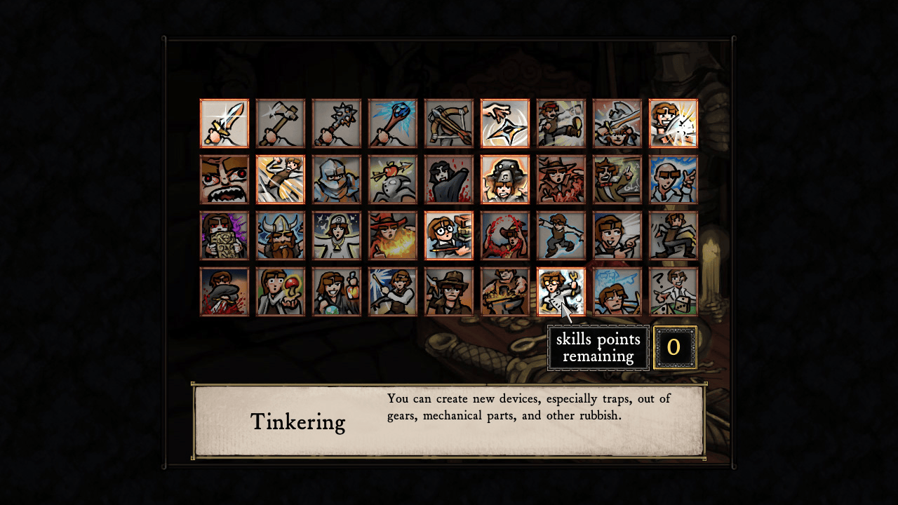 В Dungeons of Dredmor юзер сам формирует свой класс. При создании персонажа геймер определяет пол своего протеже, придумывает ему имя и выбирает 7 навыков. Среди нескольких десятков умений есть владение метательным, дальнобойным, тупым и колюще-режущим оружием, разнообразные магические школы, профессии для крафта и несколько необычных специализаций. К примеру, тут можно быть вампиром или эмо (или эмо-вампиром). Можно заниматься алхимией, готовить еду (она ускоряет регенерацию HP), выращивать грибы, создавать металлы, ковать клинки, арбалеты, бижутерию и разную броню. При этом здесь позволяют комбинировать скиллы как угодно.