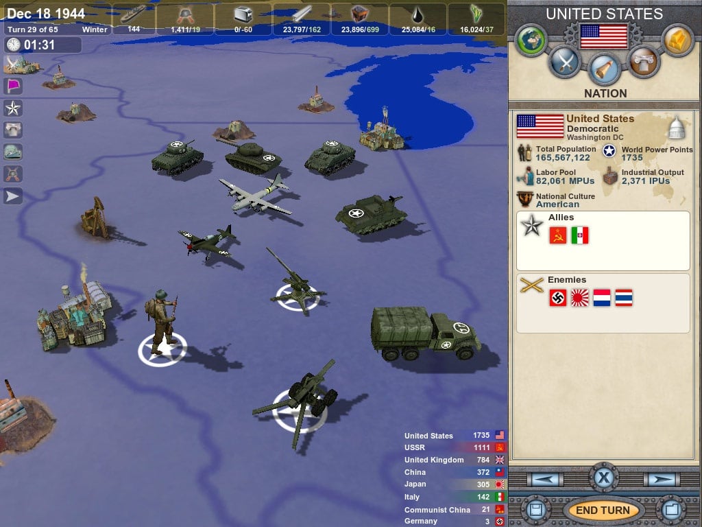 Занимайтесь научными исследованиями и сразите всех врагов. Ищите союзников или объявляйте другим государствам войну. Кампания состоит из 6 уникальных сценариев. События покажут падение Франции, атаку на Перл-Харбор, высадку на Атлантическом побережье и т.д. Доступен мультиплеерный режим на 8 игроков и редактор карт, позволяющий создавать свои карты и писать собственные сценарии.