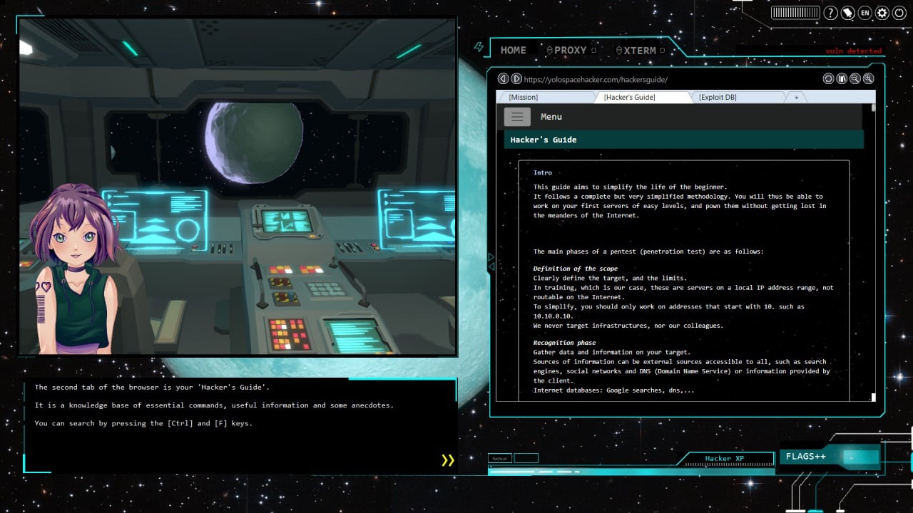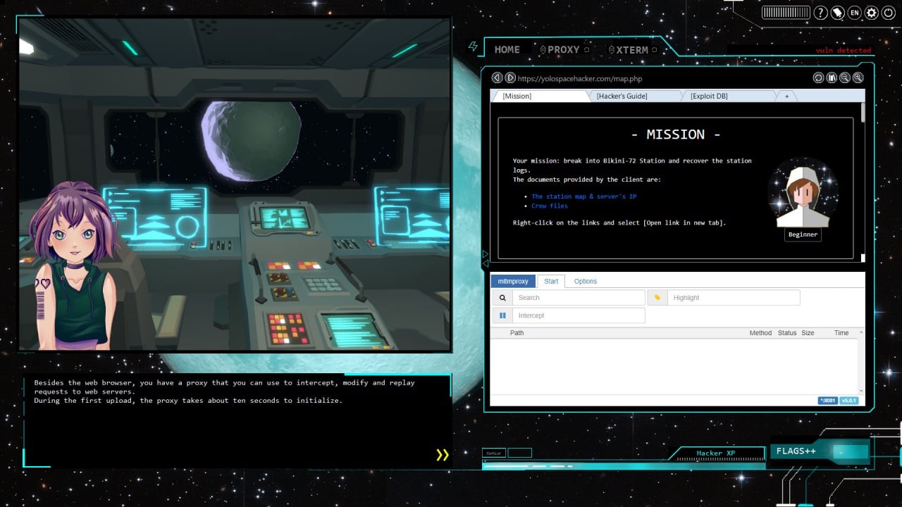 Присоединившись к организации Y0L0 Space Hacker Agency, ваша первая задача состоит в том, чтобы произвести взлом целого космо-шаттла. Узнайте, что произошло на станци. Решайте головоломки, основанные на реальных нарушениях безопасности и взломе протоколов. Подбирайте пароли, перехватывайте и обрабатывайте веб-запросы, улучшайте свои навыки и выполняйте более сложные задачи.