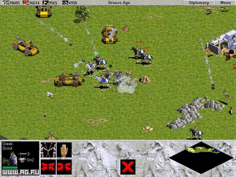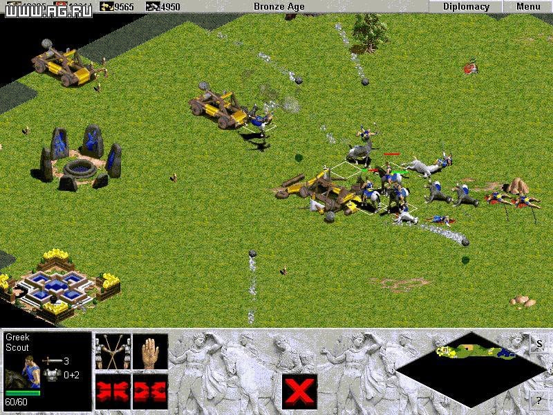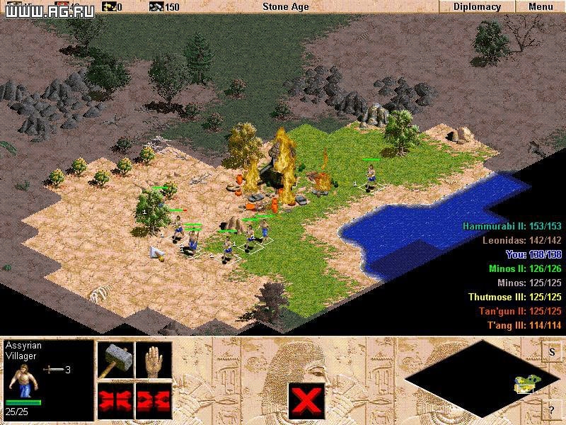 Age of Empires - стратегия в реальном времени, положившая начало одноименной франшизе Эпоха империй. Предлагается выбрать одну из 12 стран, играя за которую вы переходите в новые эпохи, постепенно развиваясь и становясь сильнее. Переходы представлены каменным, земледелием, бронзовым и железным веками. Среди представленных цивилизаций доступны Вавилон, Греция, Рим, Персия, Египет и т.д.