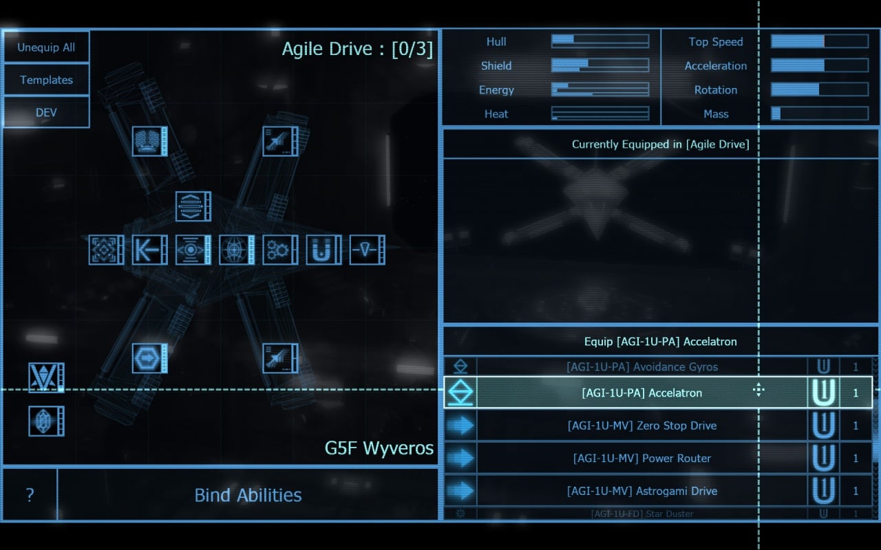 За время прохождения одиночного сюжетного режима, что занимает около 30 часов, геймеру выпадет возможность перепробовать более 60 корпусов для космолёта, на котором перемещается виртуальный протеже. Каждый из них подлежит модификации под нужды каждого игрока. Для того, чтобы собирать уникальные билды, разработчики проекта добавили в своё детище более 600 скиллов разного действия. Правильное комбинирование имеющихся сил увеличивает огневую мощь летательного транспорта.