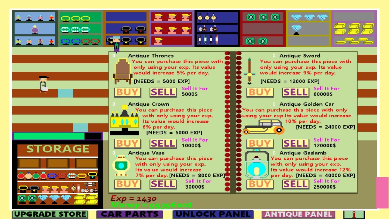 Получайте большую прибыль благодаря оригинальным открытиям и обновлениям. Здесь вы будете делать обычные клики, чтобы управлять собственным рынком, пользуйтесь новыми темпами для перехода и выполняйте новые задания. В любое время можно открывать и развивать магазинчики. Станьте владельцем небольшого продуктового магазина, либо продавайте технику, ювелирные украшения или создайте автомобильную галерею.