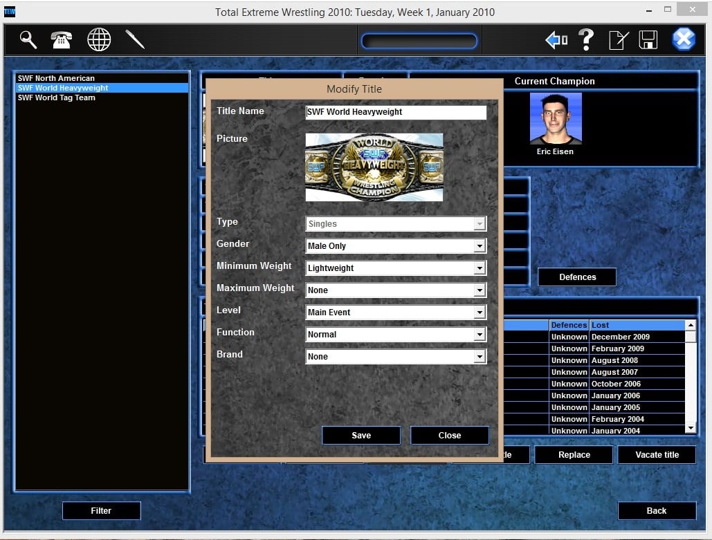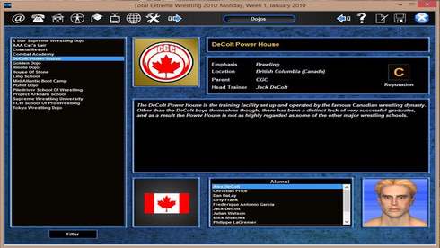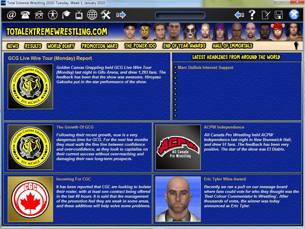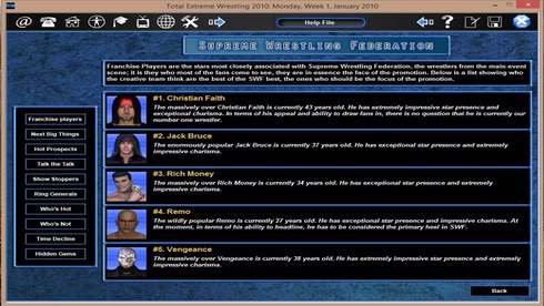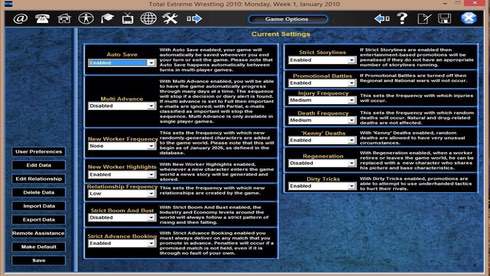 Total Extreme Wrestling 2010 перенесет вас в ожесточенные реслинг-схватки между здоровяками. Данный симулятор предоставляет возможность побывать в роли промоутера команды, чтобы вывести собственную группировку на вершину сцены. Здесь предстоит постепенно прокачивать подопечных, искать врагов, равных по силе, придумывать стратегии и тактики, либо менять спортсменов. Контролируйте каждый аспект своей организации. Общайтесь с суперзвездами, ведите переговоры с другими компаниями и борцовскими промоушенами. Будьте требовательны к своим подопечным и выступайте на местных телеканалах, чтобы дать интервью и рассказать о дальнейших планах команды. Борцы постепенно меняют стиль боя, на что никак нельзя повлиять. На это могут оказать влияние лишь травмы, возраст, уровень навыков и прочие аспекты. Функции Total Extreme Wrestling 2010: