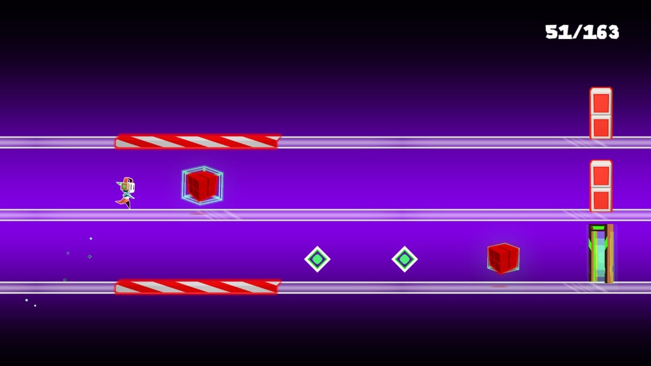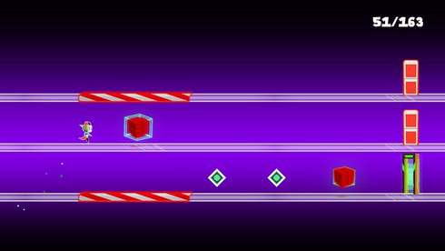 Процесс сочетает элементы хардкорной механики и неоновой графики с 5-ю саундтреками. Начав со старта, предстоит добежать до контрольной точки, а в режиме бесконечного бега невозможно победить, лишь постараться набрать наибольшее количество поинтов. Очки зарабатываются по ходу бега и преодоления встречных ловушек. Бегущий собирает бонусы и поинты, что повлияет на окончательный счет после матча. Центральному персонажу предстоит избегать тупиков на своём пути, перемещаясь по 3 платформам, падая на нижнюю, либо прыгая на верхнюю.