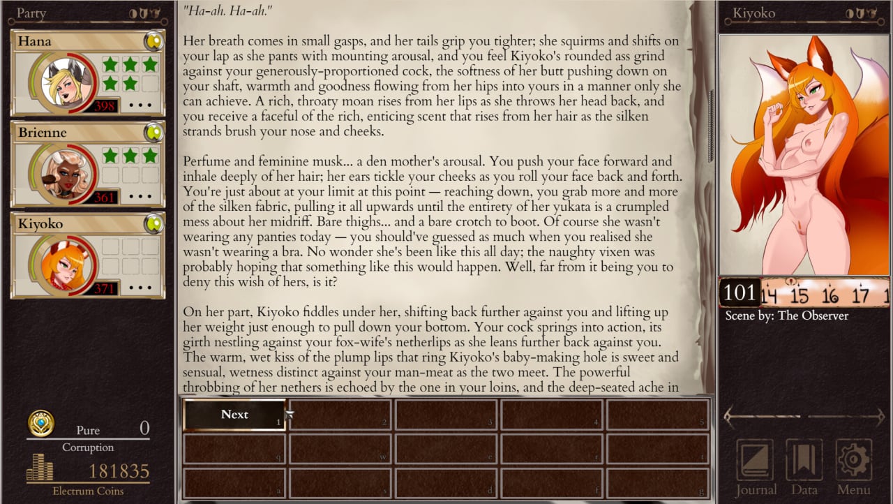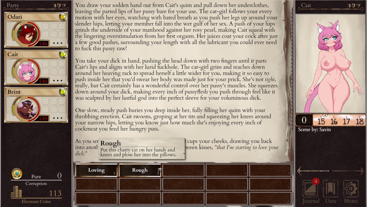 Corruption of Champions 2 - фэнтезийная ролевая игра, содержащая огромное количество сексуальных сцен и наготы. Отправляйтесь в путешествие, в котором вам предстоит встретить множество горячих девушек и выполнить десяток разнообразных квестов. Боевка выполнена в классической пошаговой стилистике. Среди героинь вы встретите таких горячих барышень, как Арона, Атугия, Бервин, Бриенна, Бринт, Кейт, Этерин, Киёко, Квинтиллус и многих других. Каждая девушка имеет индивидуальный характер и владеет уникальными навыками. Путешествуйте в компании горячих цыпочек и делайте выбор, с кем из них вы хотите выстроить романтические и сексуальные отношения.