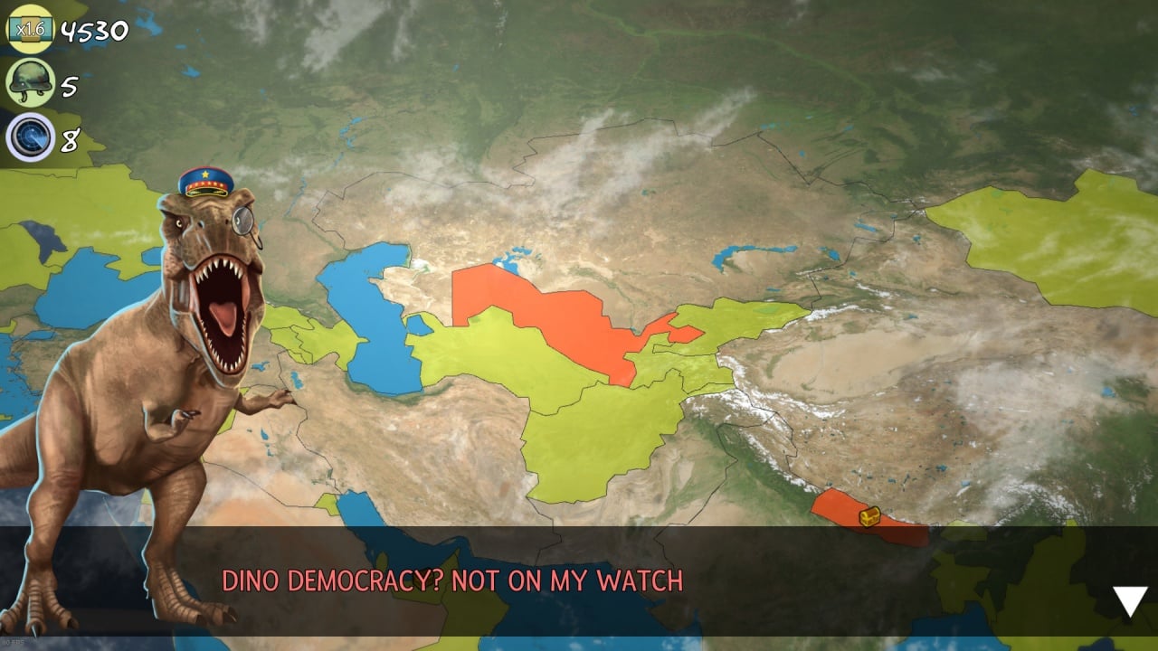 На карте также присутствуют тираннозавры. Они тоже пытаются застолбить за собой земли. Чтобы отвоевать у них территорию, нужно давать ответы на вопросы о динозаврах. В игре есть сотни диалоговых строк и более 180 государств. Также имеется обучение. Можно накапливать подсказки и пользоваться ими в особо трудных ситуациях. Геймплей разбавляется мини-играми и испытаниями на время. А для перфекционистов и хардкорщиков есть система достижений и возможность усложнить процесс с помощью особых опций.