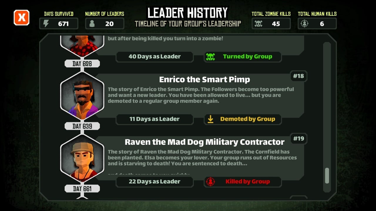 Также здесь нужно отстраивать базу. Остальной игровой процесс напоминает текстовые квесты. В них надо выполнять задания, сражаться с зомби, прокачивать своего протеже, знакомиться с другими уцелевшими путниками и даже крутить романы. Рано или поздно протагонист погибнет. Умереть здесь можно десятками разных способов. Героя могут свергнуть, он может быть укушенным и стать зомби и т. п. На место павшего руководителя придет новый человек, и тогда история продолжится.